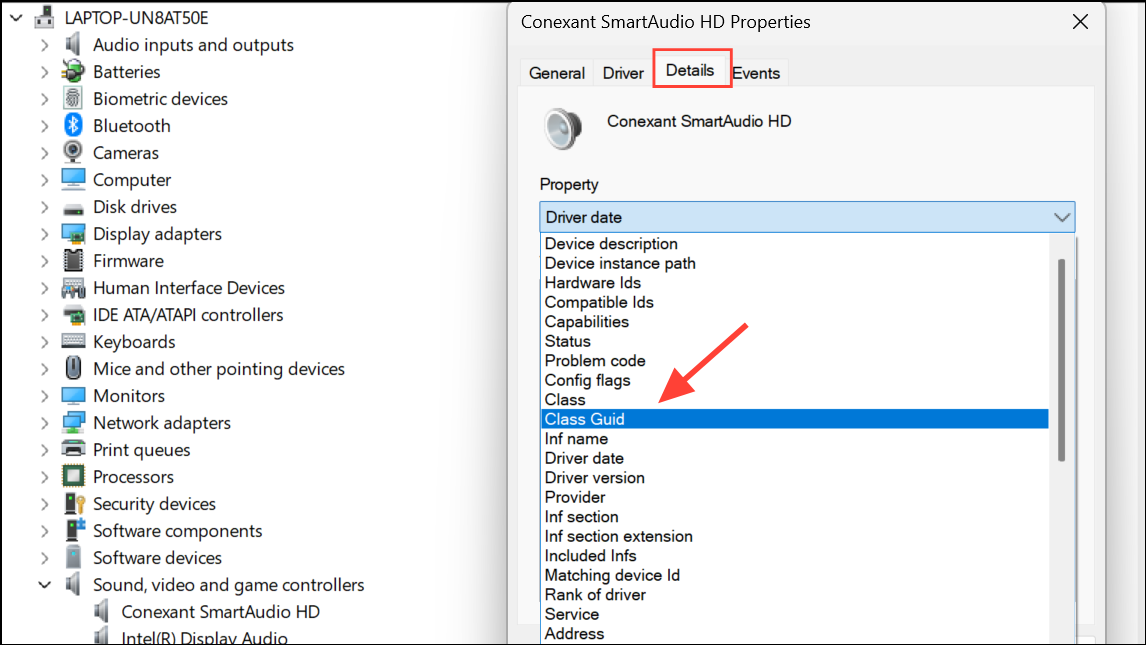 Step 2: Identify your audio device’s Class GUID. Open Device Manager, right-click your audio device, select Properties, go to the Details tab, and select Class GUID from the Property dropdown. Copy the value.