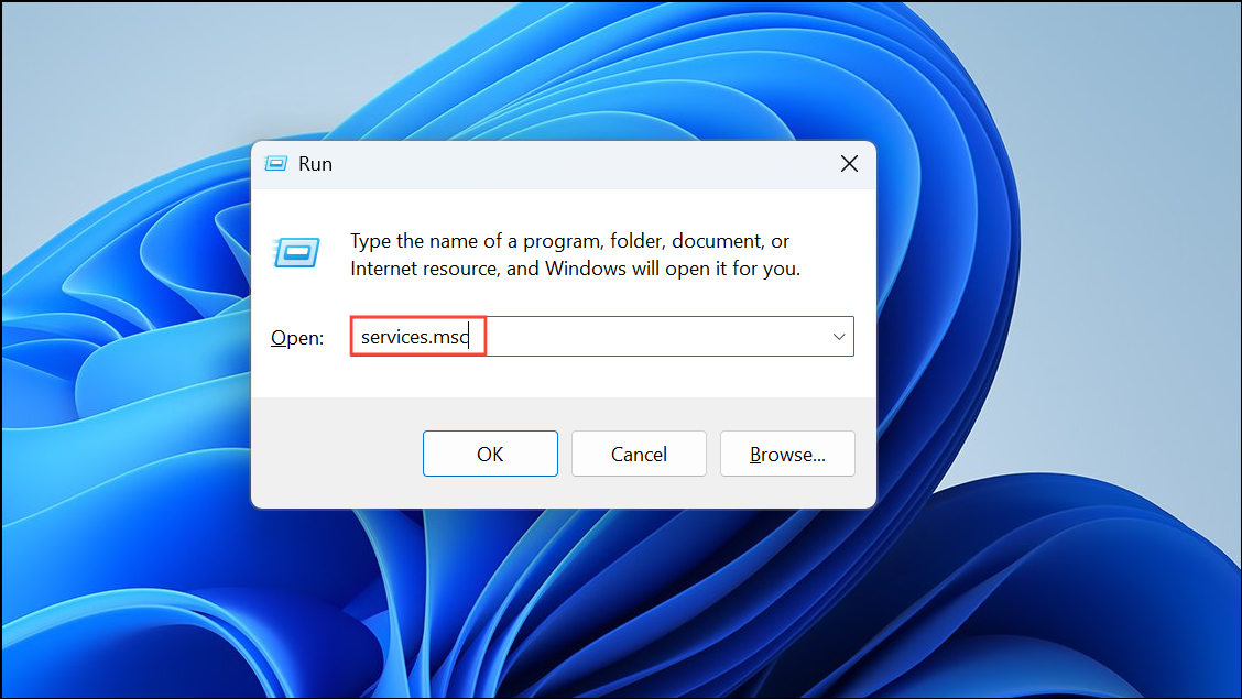 Step 1: Press Windows + R to open the Run dialog. Type services.msc and press Enter to open the Services window.