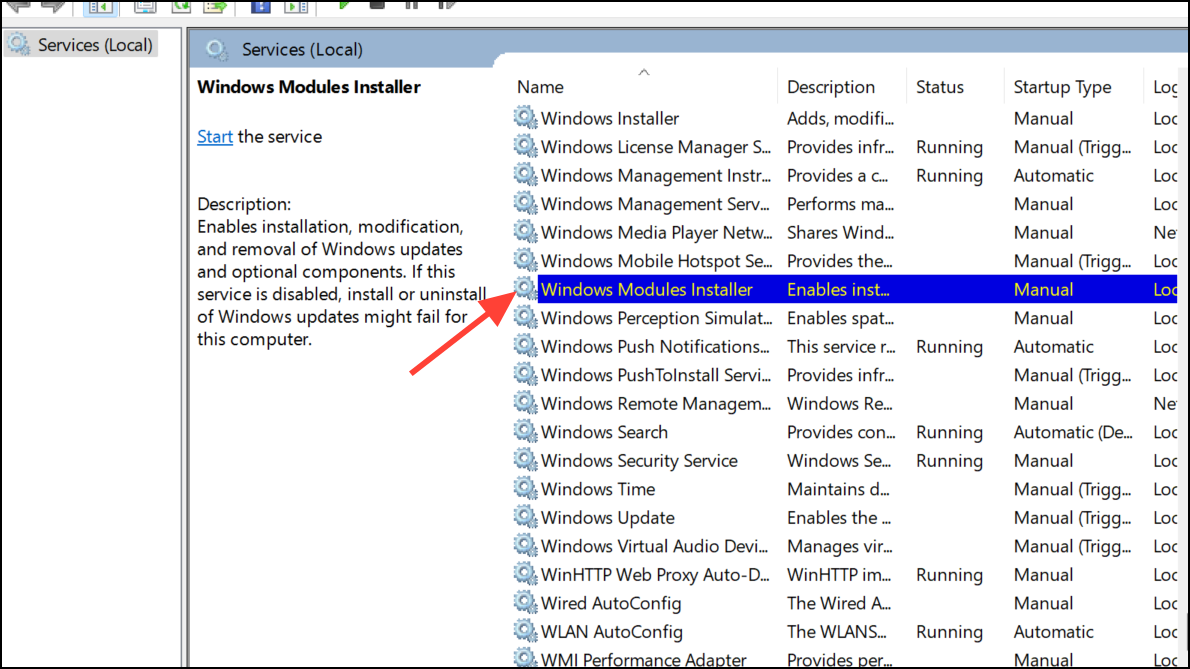 Step 2: Scroll through the list and locate Windows Modules Installer. Double-click it to open its properties.