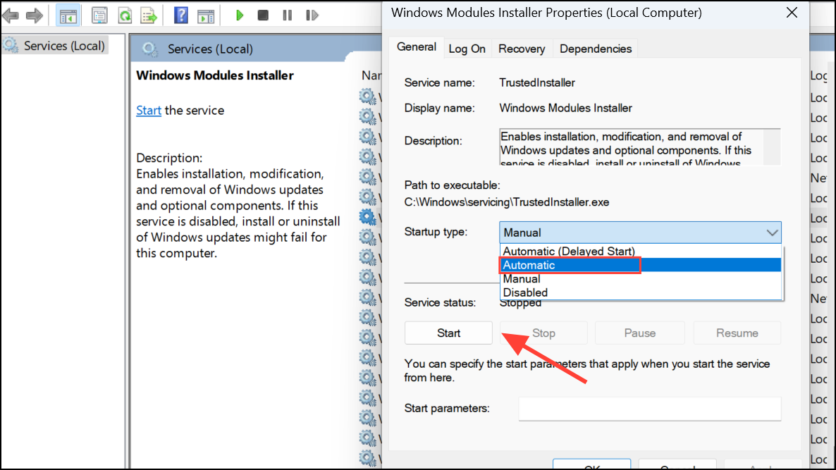 Step 3: Set the Startup type to Manual or Automatic using the dropdown menu. If the service status is Stopped, click Start to run it.
