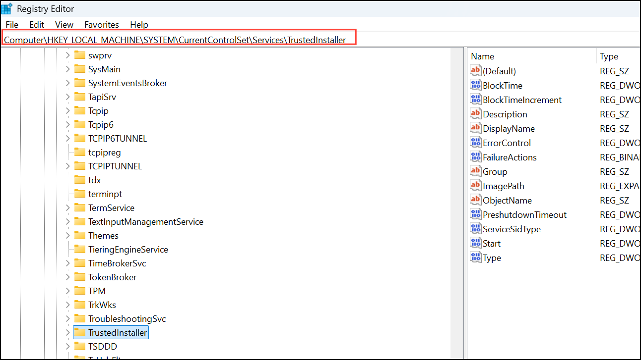 HKEY_LOCAL_MACHINE\SYSTEM\CurrentControlSet\Services\TrustedInstaller