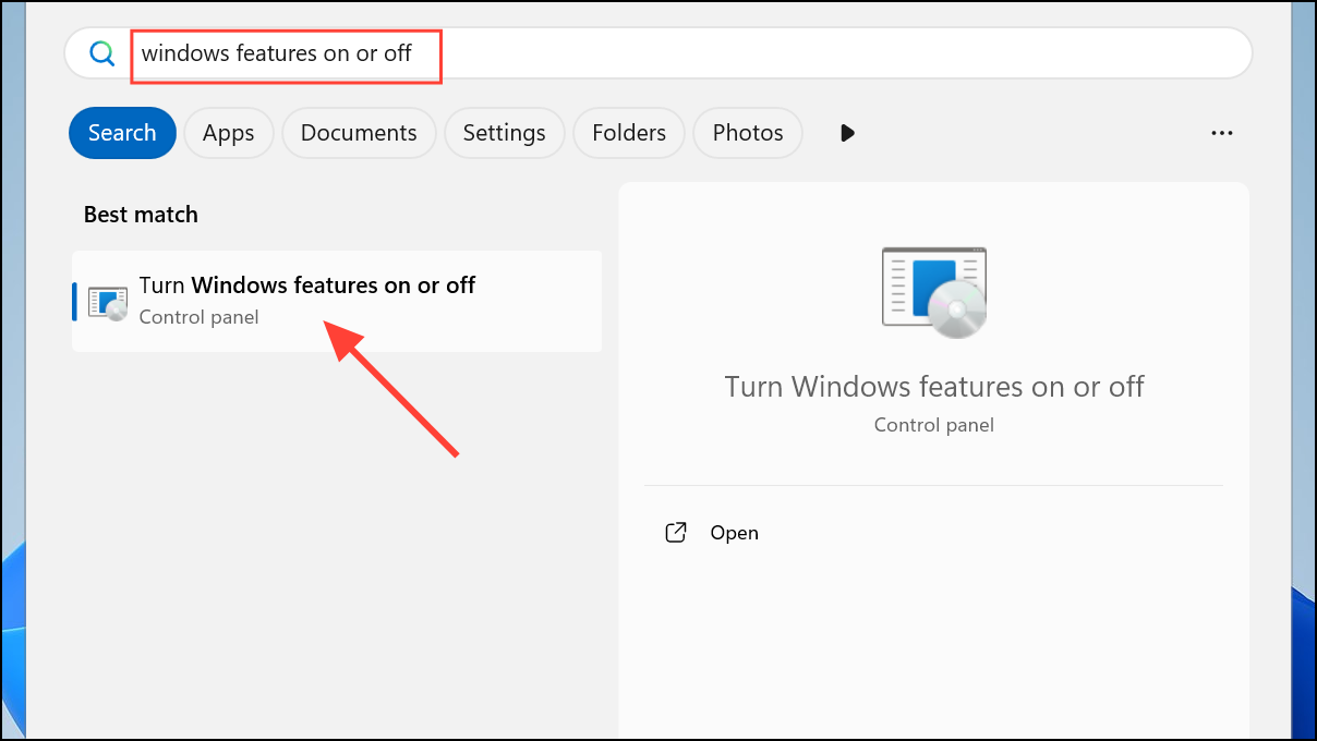 Step 1: Open the Start menu and type Turn Windows features on or off. Select the matching result to launch the Windows Features dialog.