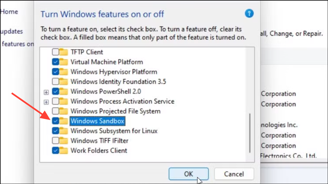 Step 2: In the list, uncheck Windows Sandbox. Click OK to remove the feature.