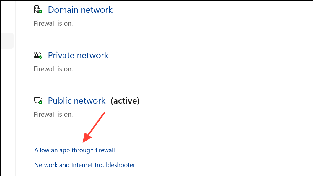 Step 2: If using Windows Defender Firewall, open the Windows Security app, go to Firewall & network protection, and select Allow an app through firewall. Ensure that Windows Sandbox is listed and allowed for both private and public networks.