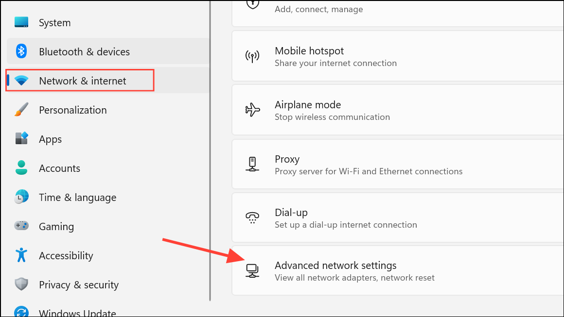 Step 1: Open Settings with Windows + I, then navigate to Network & internet > Advanced network settings.