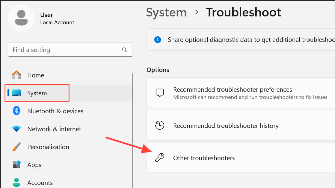 Step 1: Press Windows + I to open Settings, then go to System > Troubleshoot > Other troubleshooters.