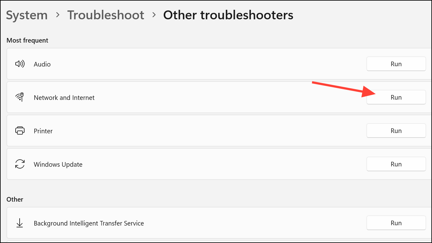 Step 2: Find Network and Internet and click Run. Follow the on-screen instructions to let Windows identify and resolve issues.