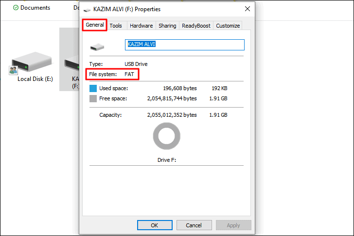 In the ‘Properties’ window, the ‘General’ tab will open by default. Now, note the ‘File System’ mentioned near the top.