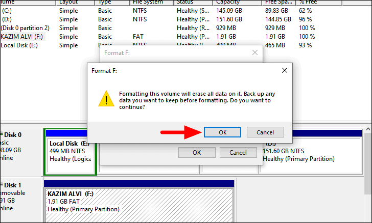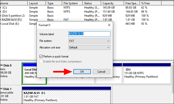 A box will pop up where you can change the ‘Volume Label’, ‘File system’, and ‘Allocation unit size’. In case, you are looking for a simple format, it’s recommended that you don’t change the settings and click on ‘OK’ at the bottom to start the format.