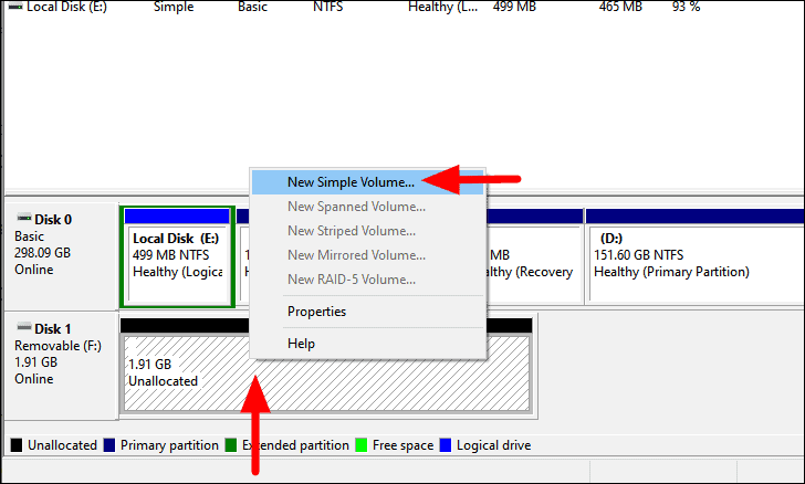 To format a drive, right-click on the drive listed at the bottom of the ‘Disk Management’ window and select ‘New Simple Volume’ from the context menu.