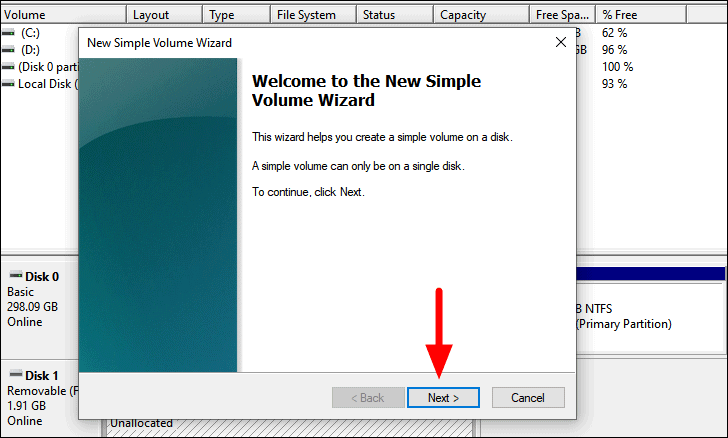 The ‘New Simple Volume Wizard’ window will now launch. Click on ‘Next’ at the bottom to continue.