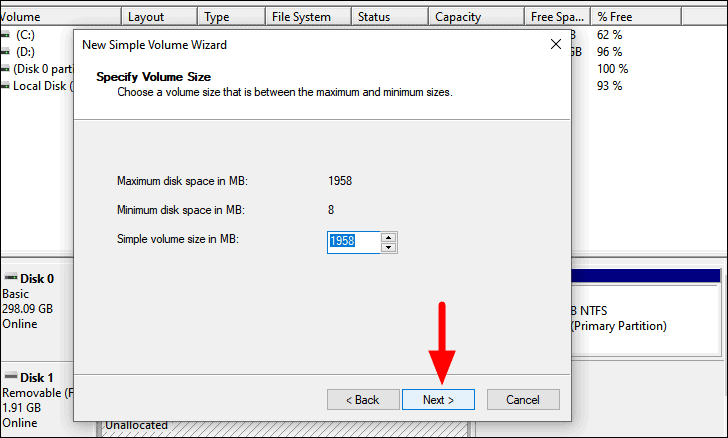 On the next screen, you can specify the size of the new simple volume. If you are not versed with the concept, it’s recommended to leave it unchanged and click on ‘Next’ to proceed.