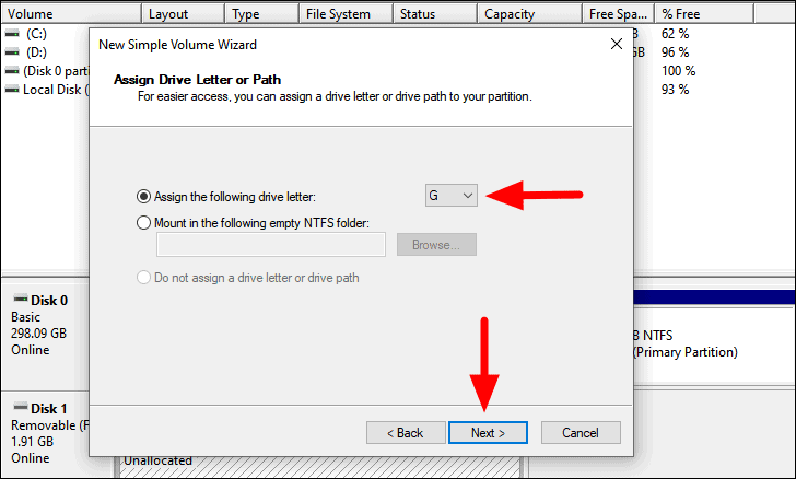 Now, you can choose the ‘Drive Letter’ by clicking on the box next to the option and then select the desired option from the drop-down list. After you have made the selection, click on ‘Next’ at the bottom to proceed.
