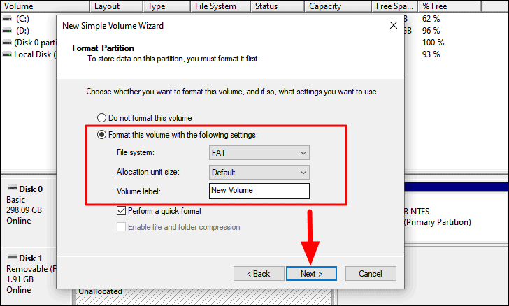 On the next screen, the checkbox for formatting the drive will be selected by default. You can make modifications in the File System, Allocation unit size, and Volume Label as desired, and then click on ‘Next’.