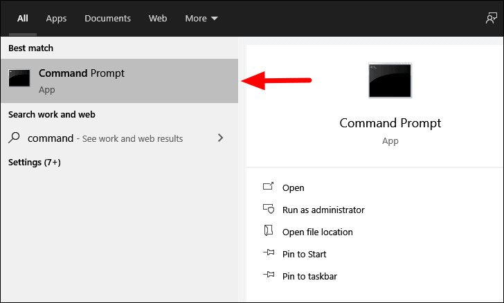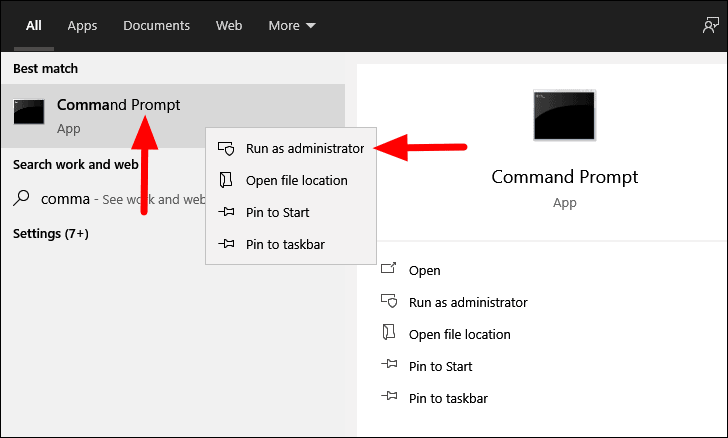 To format with the ‘DiskPart’ command, search for ‘Command Prompt’ in the ‘Start Menu’, right-click on the search result, and select ‘Run as administrator’ from the context menu.