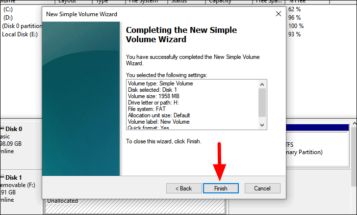 Finally, review the settings for the new volume and then click on ‘Finish’ to complete the process, if everything is in order.