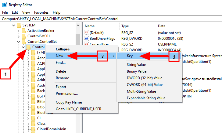 If you can’t find the key, create one. To create a key, right-click on the ‘Control’ option, hover the cursor over ‘New’, and then select ‘Key’ from the list of options. Name the key as ‘StorageDevicePolicies’.