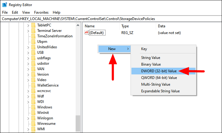 After you have created the key, right-click on the empty portion at the right, hover the cursor over ‘New’, and select ‘Dword (32-bit) Value’ from the menu that appears. Name the entry as ‘WriteProtect’.