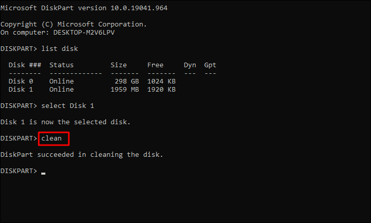 You will now receive a message that the particular disk has been selected. The next step is to clean the disk. Type or paste the following command and then press ENTER.