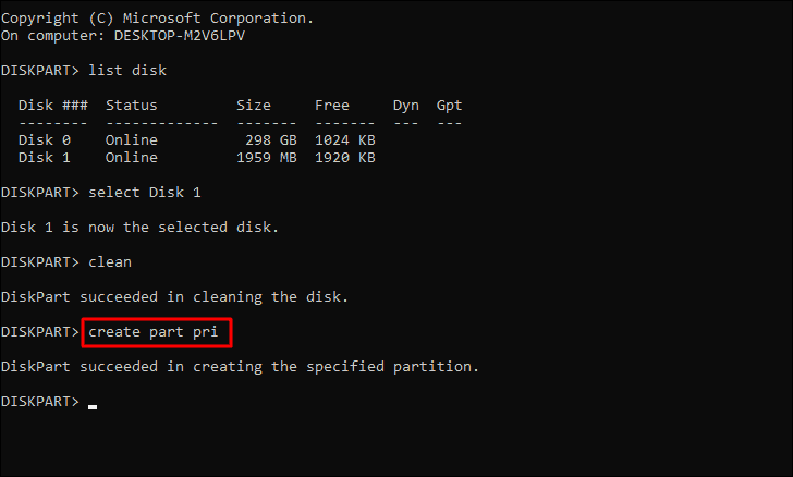 You have now removed any existing partitions and formatting from the disk, however, it’s hasn’t been formatted yet. Next, type or paste the following command, and then press ENTER to execute it.