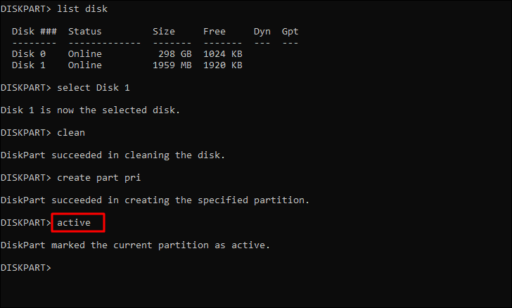 You have now created a partition and the next step is to mark it as active. To do so, type/paste the following command and hit ENTER.