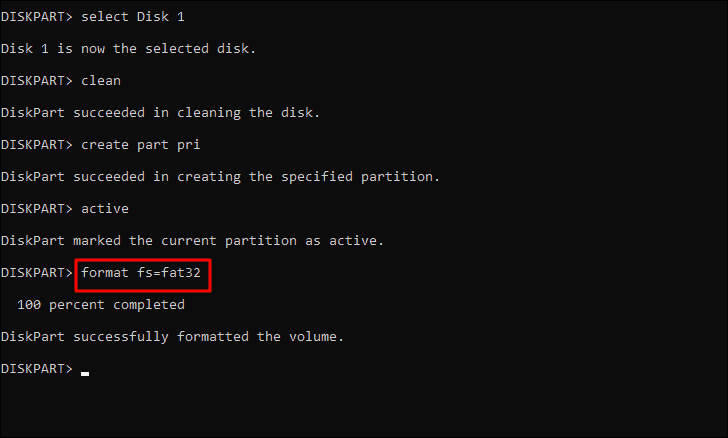 In this case, we are formatting a drive under 4 GB, hence, we have used the ‘FAT32’ file system. However, if yours is more than 4 GB, just replace the ‘fat32’ part in the command with ‘NTFS’.
