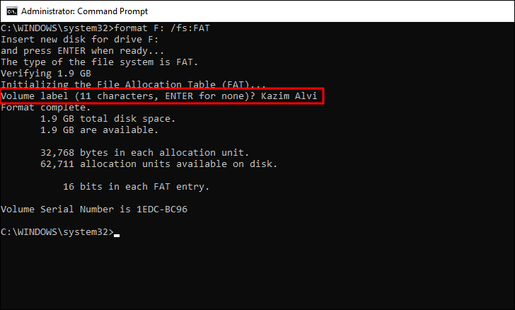 You will now be asked to set a ‘Volume Label’, i.e., the name of the drive. Type the label name and press ENTER to set a name. You can also skip the step by simply pressing ENTER without entering a volume label, in which case, it will be set as ‘New Volume’ followed by the drive letter.