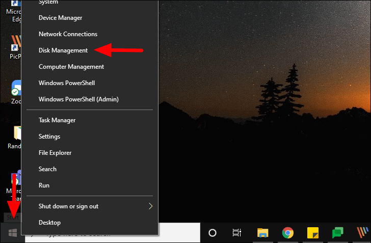 To format a drive with Disk Management, right-click on the ‘Windows’ icon at the bottom left corner of the desktop to launch the ‘Quick Access Menu’, and then select the ‘Disk Management’ option from the list.