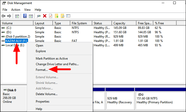 Next, locate the drive that you want to format under the ‘Volume’ column. Now, right-click on the drive, and select the ‘Format’ option from the context menu.