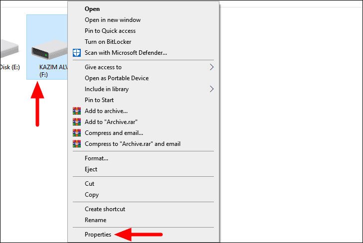 To identify the ‘File System’, right-click on the drive, and select ‘Properties’ from the context menu.