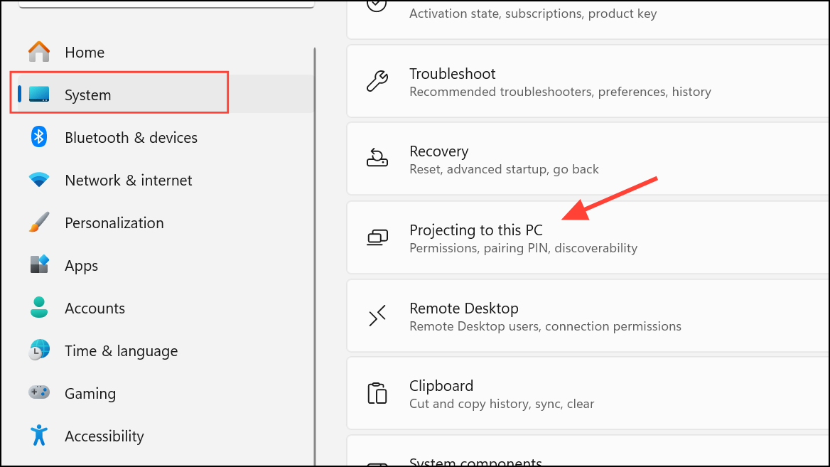 Win + Ishortcut, click System on the left, and select Projecting to this PC on the right.