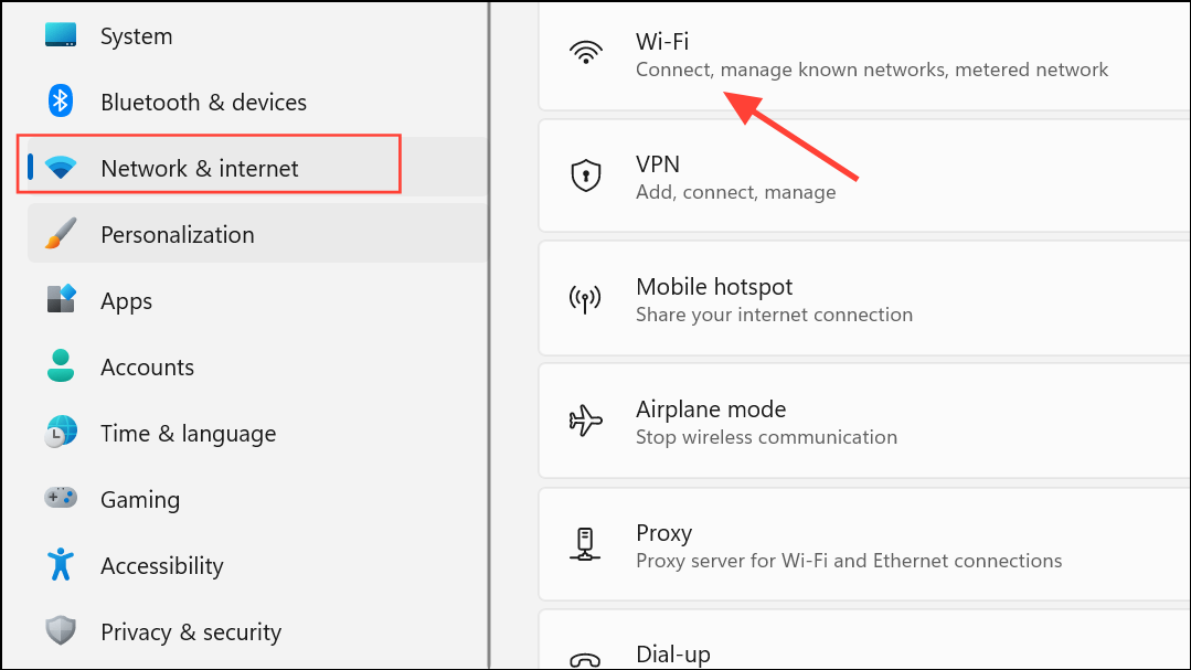 - Open the Settings app, click Network and Internet on the left, and select WiFi or Ethernet from the right, depending on your connection.