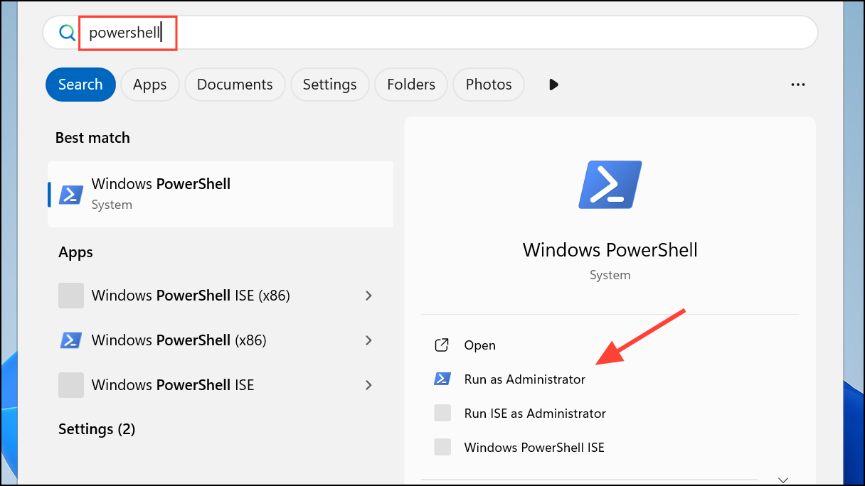 powershelland click Run as administrator.