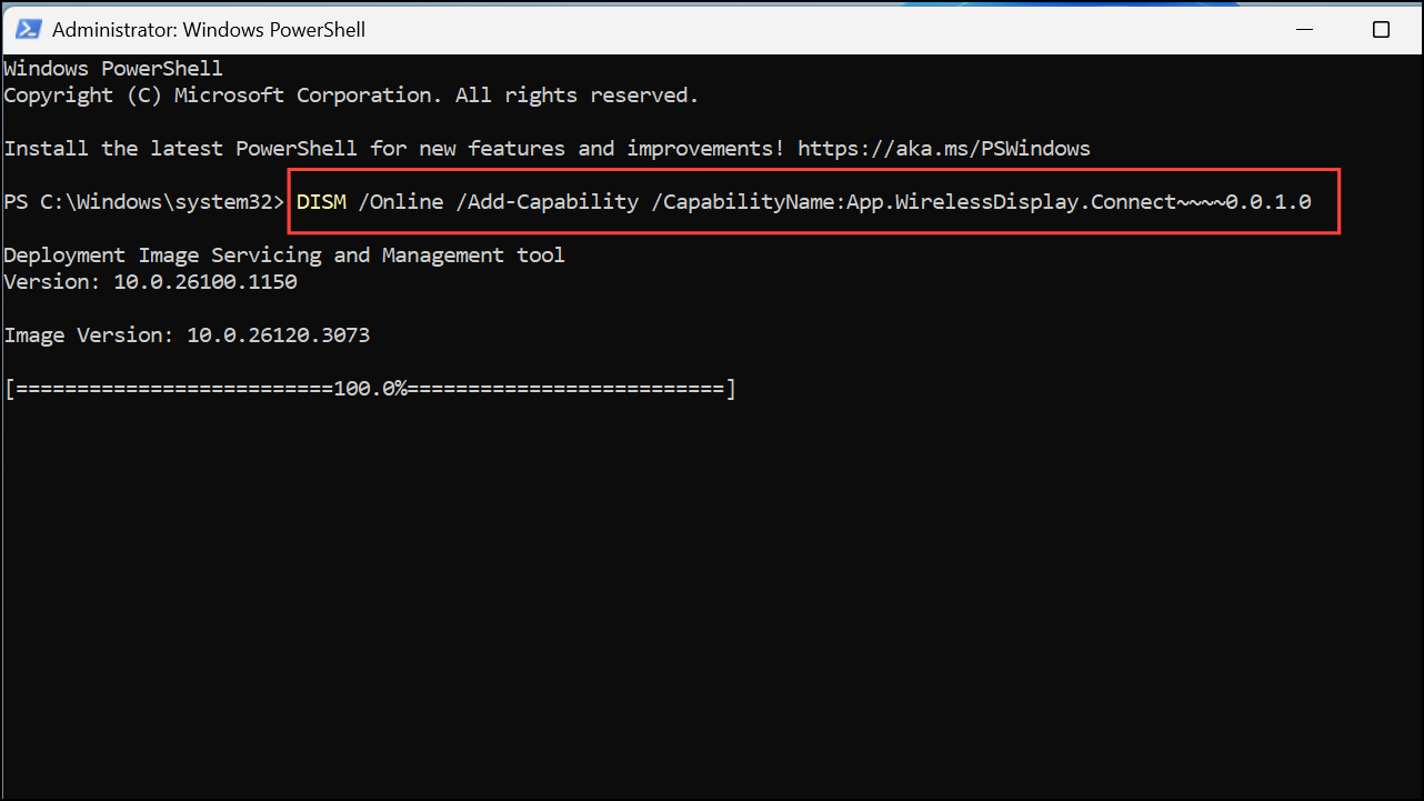 DISM /Online /Add-Capability /CapabilityName:App.WirelessDisplay.Connect~~~~0.0.1.0in PowerShell and hit Enter.