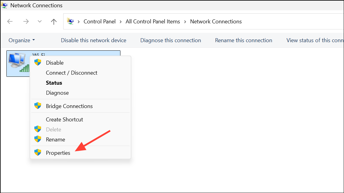 - In the Network Connections window that opens, right-click your network adapter and select Properties.
