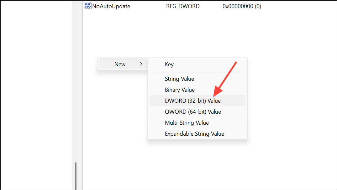 - Look for the UseWUServer entry on the right side. If there isn't one, right-click on an empty area in the right panel, go to New and select DWord (32-bit) Value. Name this entry UseWUServer.