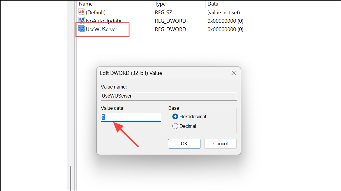 - Double-click the UseWUServer entry and set its Value data to