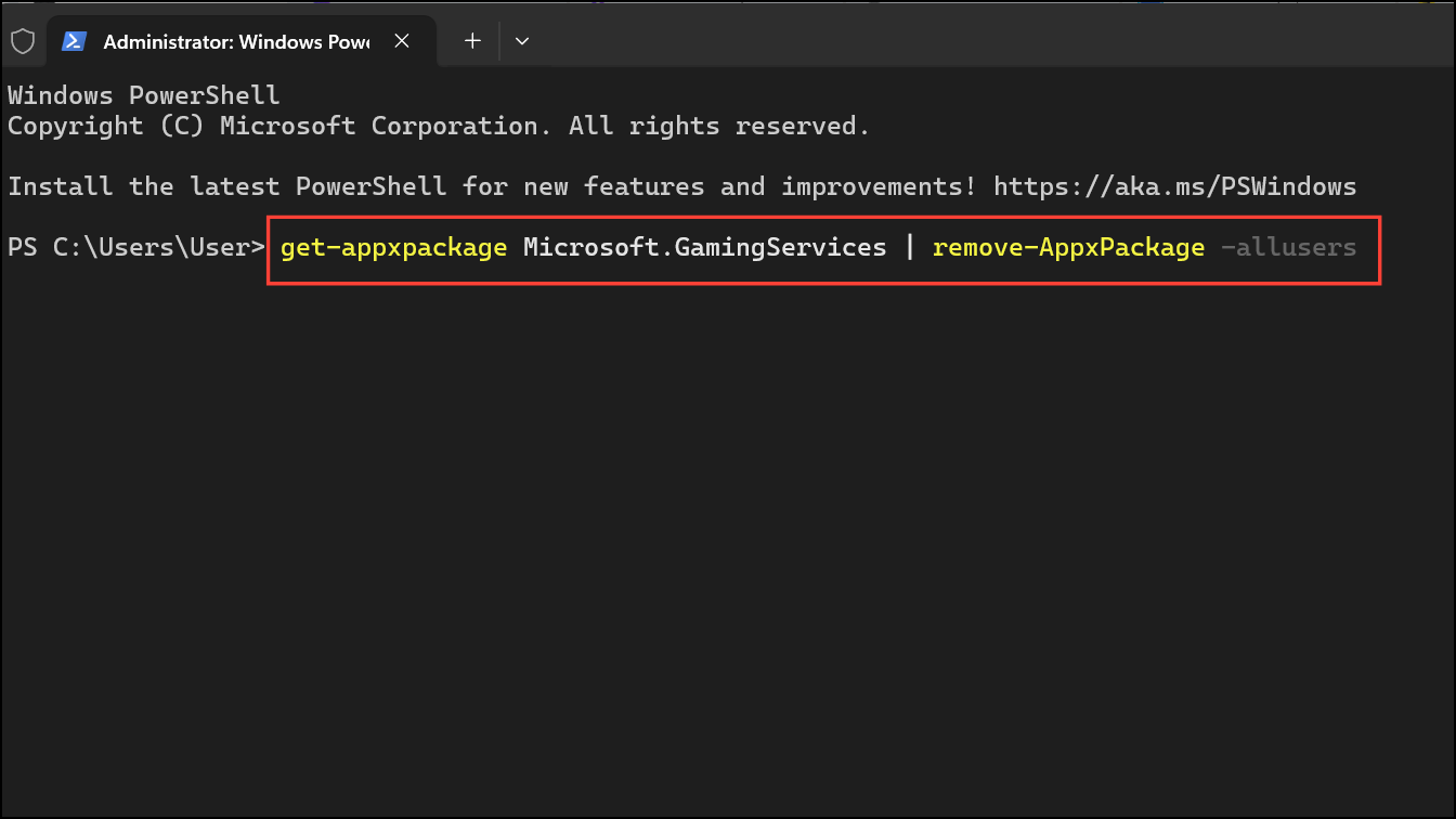 get-appxpackage Microsoft.GamingServices | remove-AppxPackage -allusers