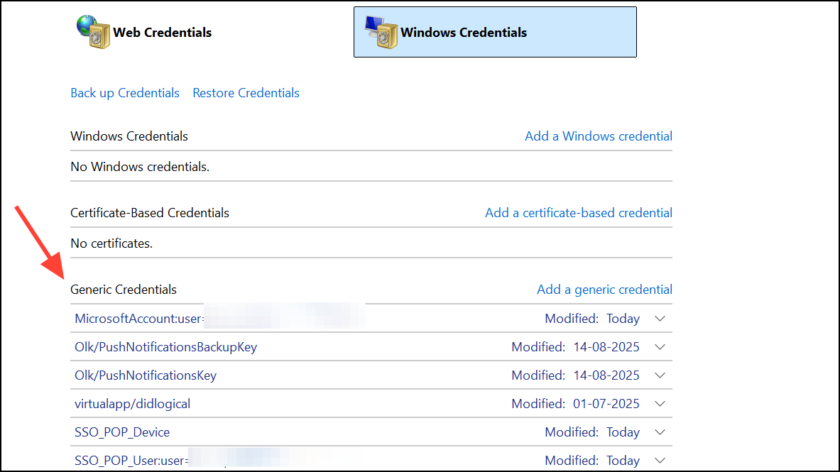 Step 4: Clear stale Xbox credentials. Press Windows + R, run control.exe keymgr.dll, open Windows Credentials → Generic Credentials, and remove all entries starting with Xbl (such as XblGrts, Xbl|, or Xbl_Ticket). These will be recreated on next sign-in.