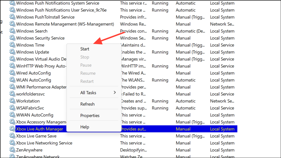 Step 7: Verify required services. Open Services as admin and ensure these are Running and set to Automatic: Xbox Live Auth Manager, Xbox Live Networking Service, Xbox Live Game Save, Gaming Services, and IP Helper. Start any that are stopped.