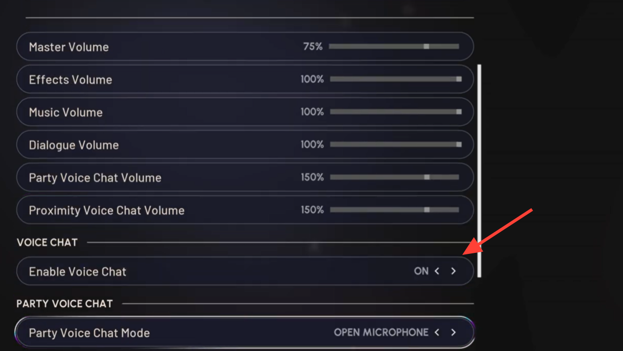 Step 3: Raise Party voice chat volume and proximity/chat volumes to a clearly audible value (for example, 100% or higher) so you can hear others.