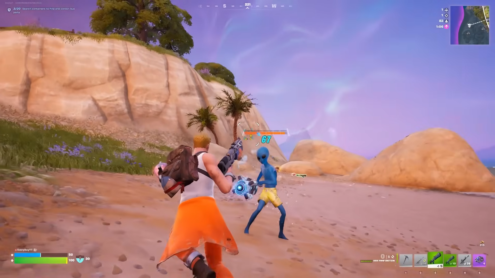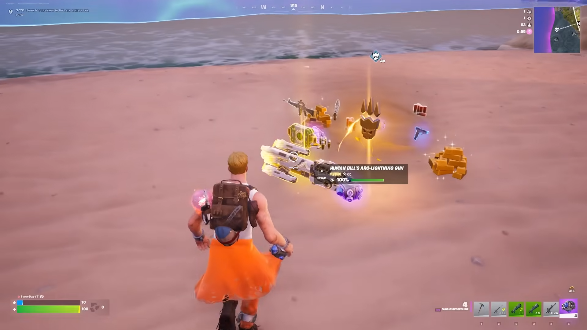 Step 1: Land near, not on, one of his possible POIs to gear up. Pick up at least one mid-range rifle and a shotgun, plus a couple of shield and health items.