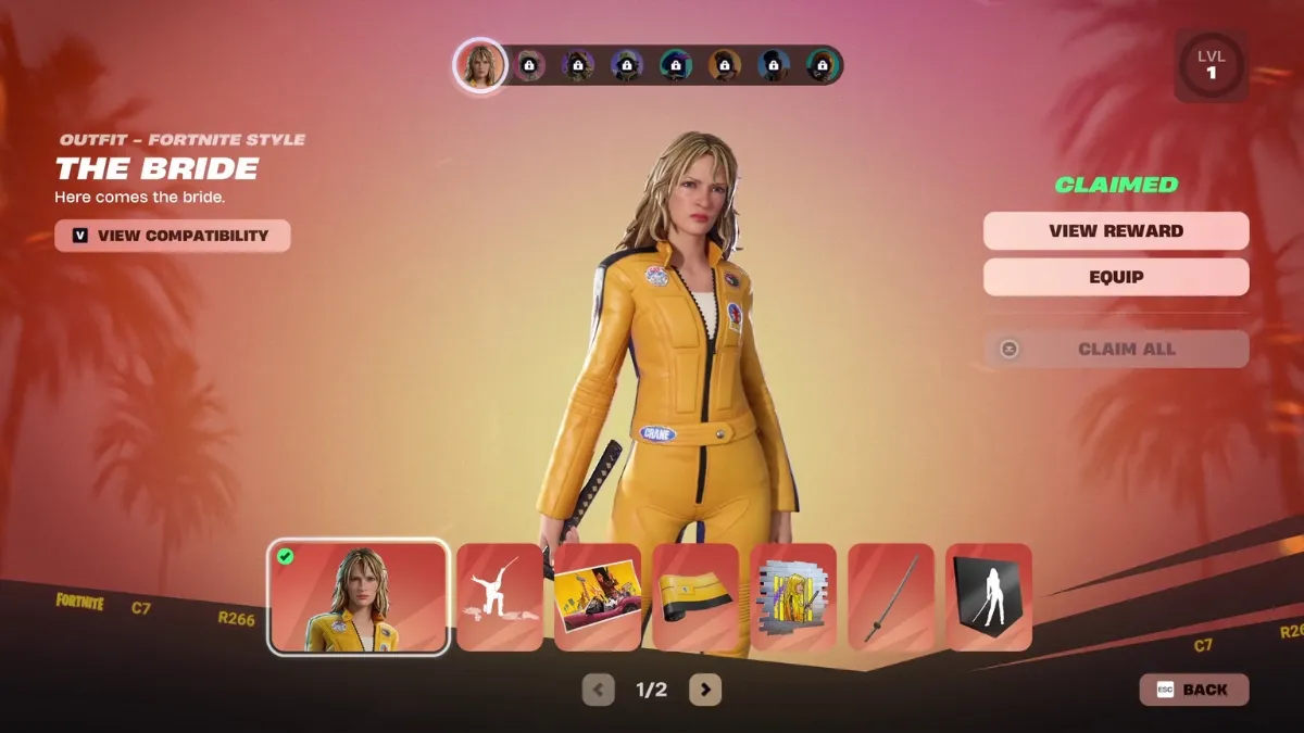 - Beatrix “The Bride” Kiddo (Kill Bill) – The Bride is the instant unlock skin. As soon as you purchase the Battle Pass or receive it via Fortnite Crew, she’s available in your locker.