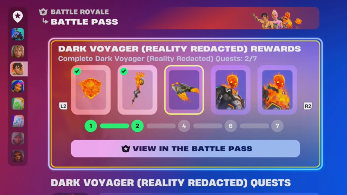 - Dark Voyager (Reality Redacted) bonus rewards unlock once you reach roughly level 85 and then complete additional quests tied to standard Battle Royale matches.