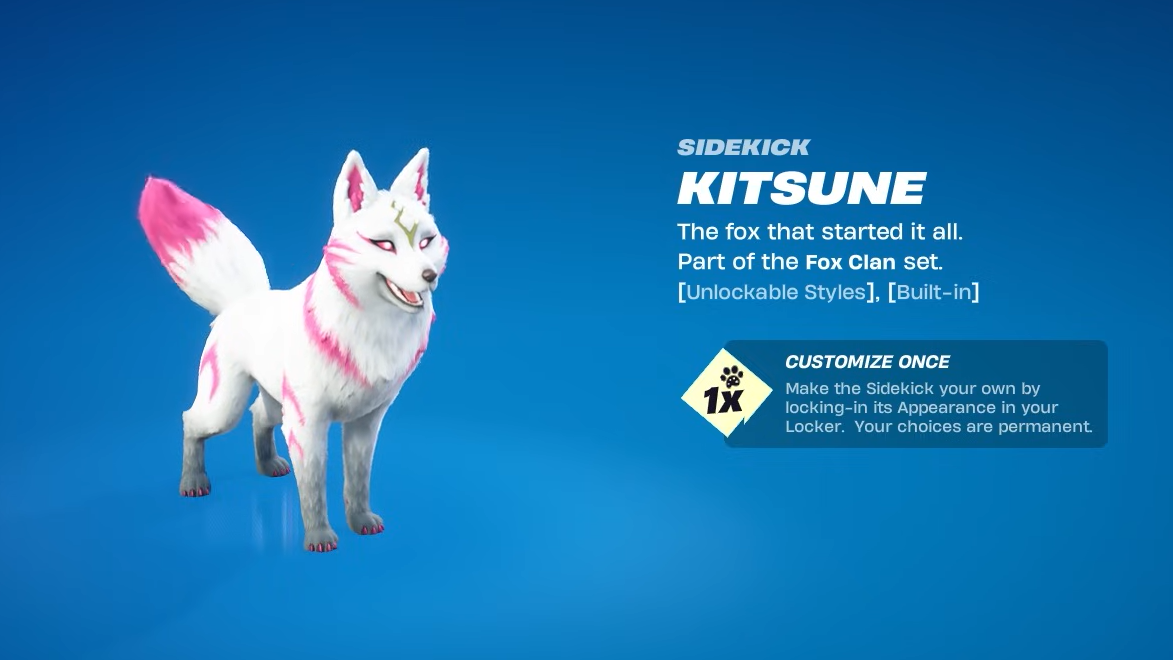 The Kitsune Sidekick brings one of Fortnite’s most popular fox pets out of back bling status and into full companion form. It is part of the Fox Clan Set and launches as an Uncommon Sidekick that can follow your character across multiple Fortnite modes, including LEGO Fortnite and Fortnite Festival.