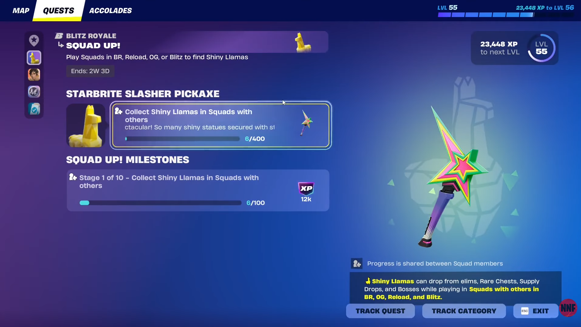 - Squad Up! milestones grant 12,000 XP per 100 Shiny Llamas collected, up to 120,000 XP at 1,000 llamas.