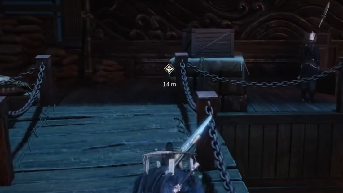 - Locked gate: After Jin Huo’s group moves on, two guards remain; taking them down reveals a locked metal gate to the dungeon. The key is held by a Deputy Captain with a long‑feathered helm in an adjacent building.