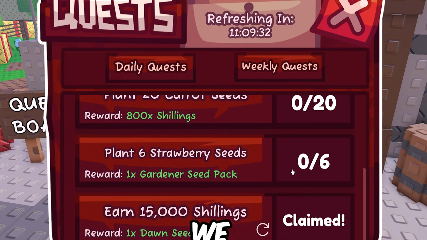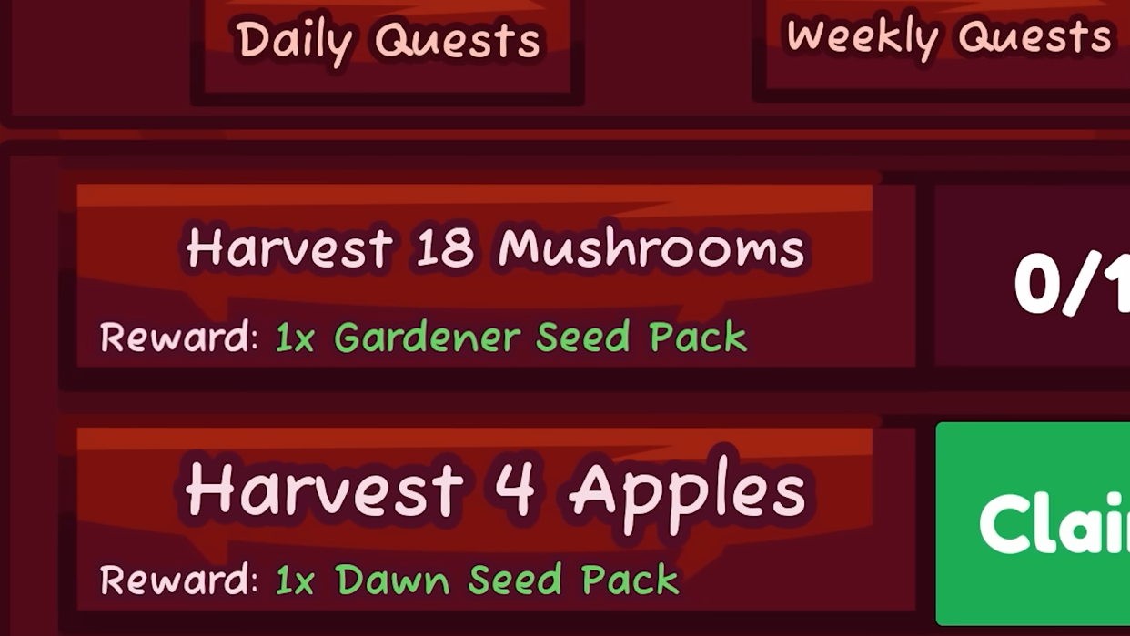 Step 1: Check the Quest Board for available Daily Quests and Weekly Quests. Daily Quests reset every 24 hours and reward a maximum of one Gardener Seed Pack per day.
