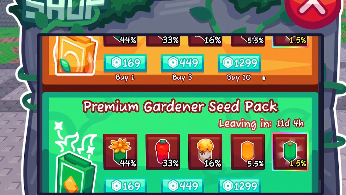 If you'd rather skip the quest grind entirely, the Gardener Seed Pack is also sold in the in-game Robux shop. Three pricing tiers are available: