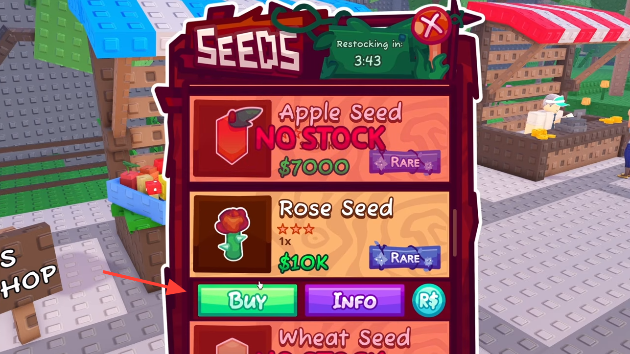 Step 2: Press the E key when you're close to the stall to open the shop interface. You'll see the current seed lineup with prices and rarities displayed.